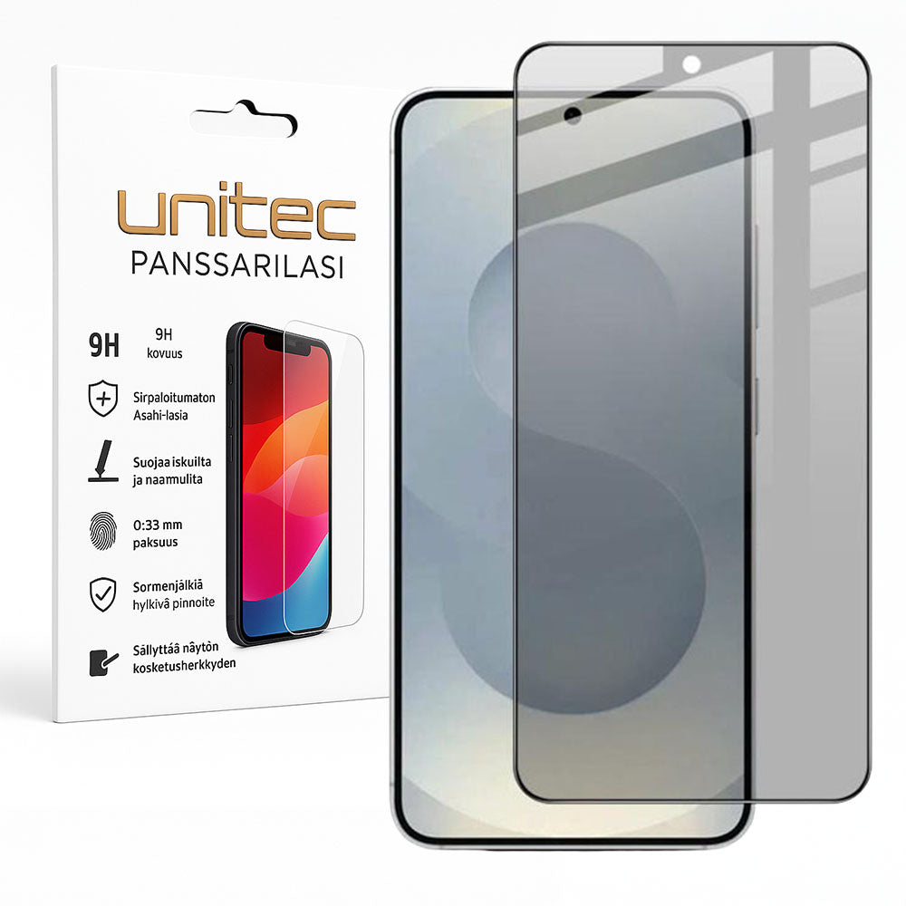 Privacy panssarilasi on suunniteltu Samsung Galaxy S26 -mallille. Se estää sivullisia näkemästä näytön sisältöä ja suojaa näyttöä naarmuilta, iskuilta ja arjen kulutukselta. Näyttö näkyy vain suoraan edestä katsottuna, joten voit käyttää puhelinta huoletta julkisissa tiloissa, töissä ja matkalla.